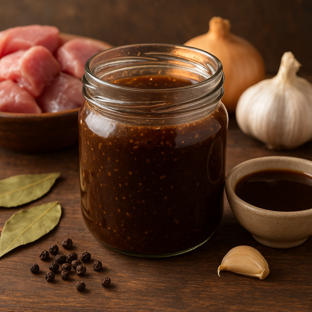 - Składniki bazy: ocet (3/4 szklanki), sos sojowy (1/2 szklanki), czosnek, liście laurowe, pieprz, 2 łyżki brązowego cukru.
