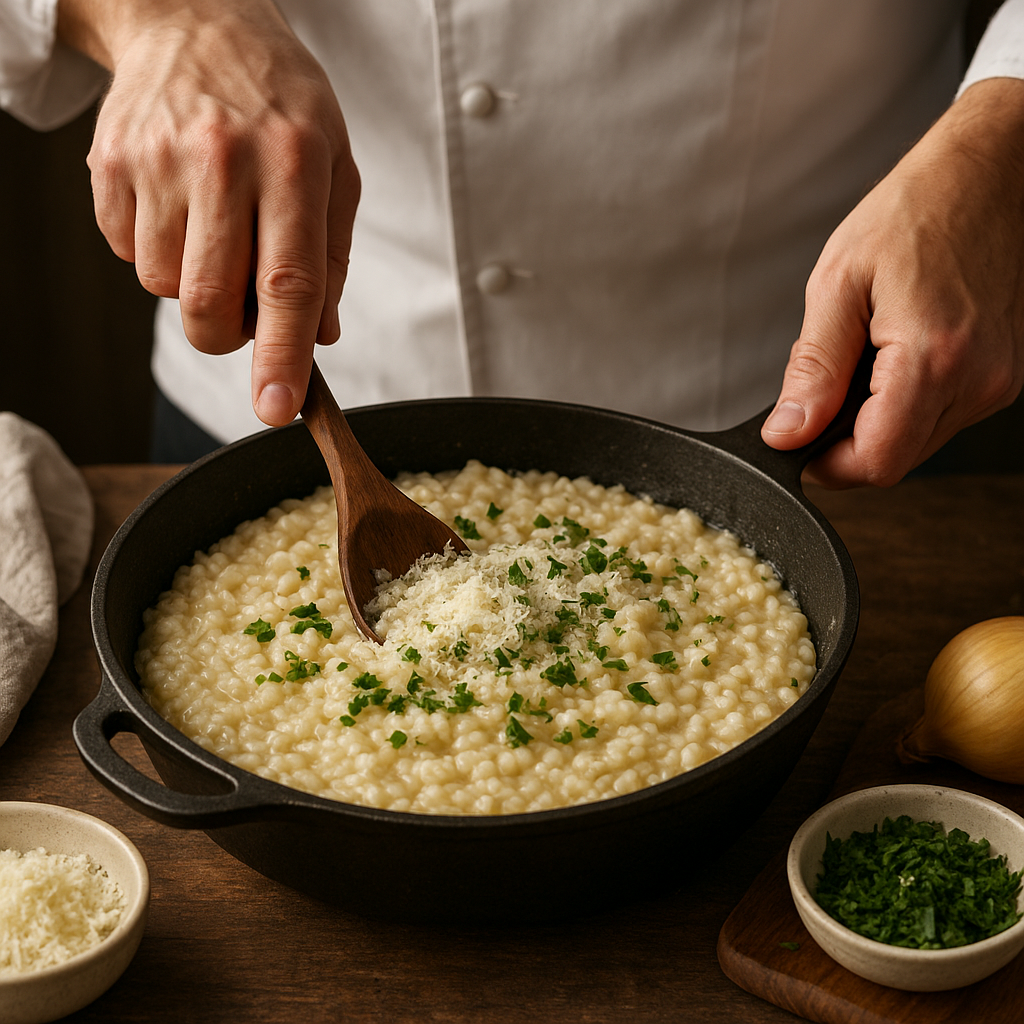 Najważniejsze, by był gorący i bez soli dodawanej na samym początku – ryż lepiej chłonie płyn, stopniowo uwalniając smak. W klasycznym przepisie bulion warzywny może zostać zastąpiony bulionem drobiowym lub rybnym, w zależności od tego, czy planujesz przygotować risotto z grzybami, owocami morza czy szparagami.
