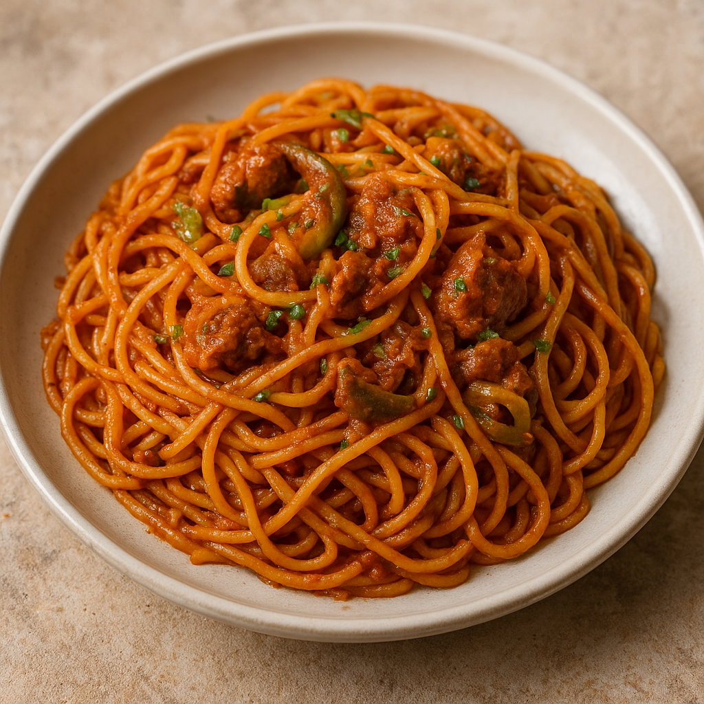 Smacznego — niech Twoje Jollof Spaghetti będzie pełne koloru, aromatu i radości z gotowania!