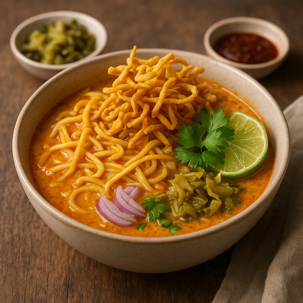 Khao Soi to przede wszystkim połączenie aromatu curry z kremowością mleka kokosowego, świeżości dodatków i pikantności przypraw. Kluczowe składniki, które definiują ten smak, to pasta curry (tradycyjnie żółta lub mieszana), kurczak lub inne mięso, makaron jajeczny oraz przyprawy takie jak galangal, kurkuma i kmin. Dodatki podkreślające smak to marynowana kapusta lub musztardowe zielone warzywo, limonka, cebula i olej chili.