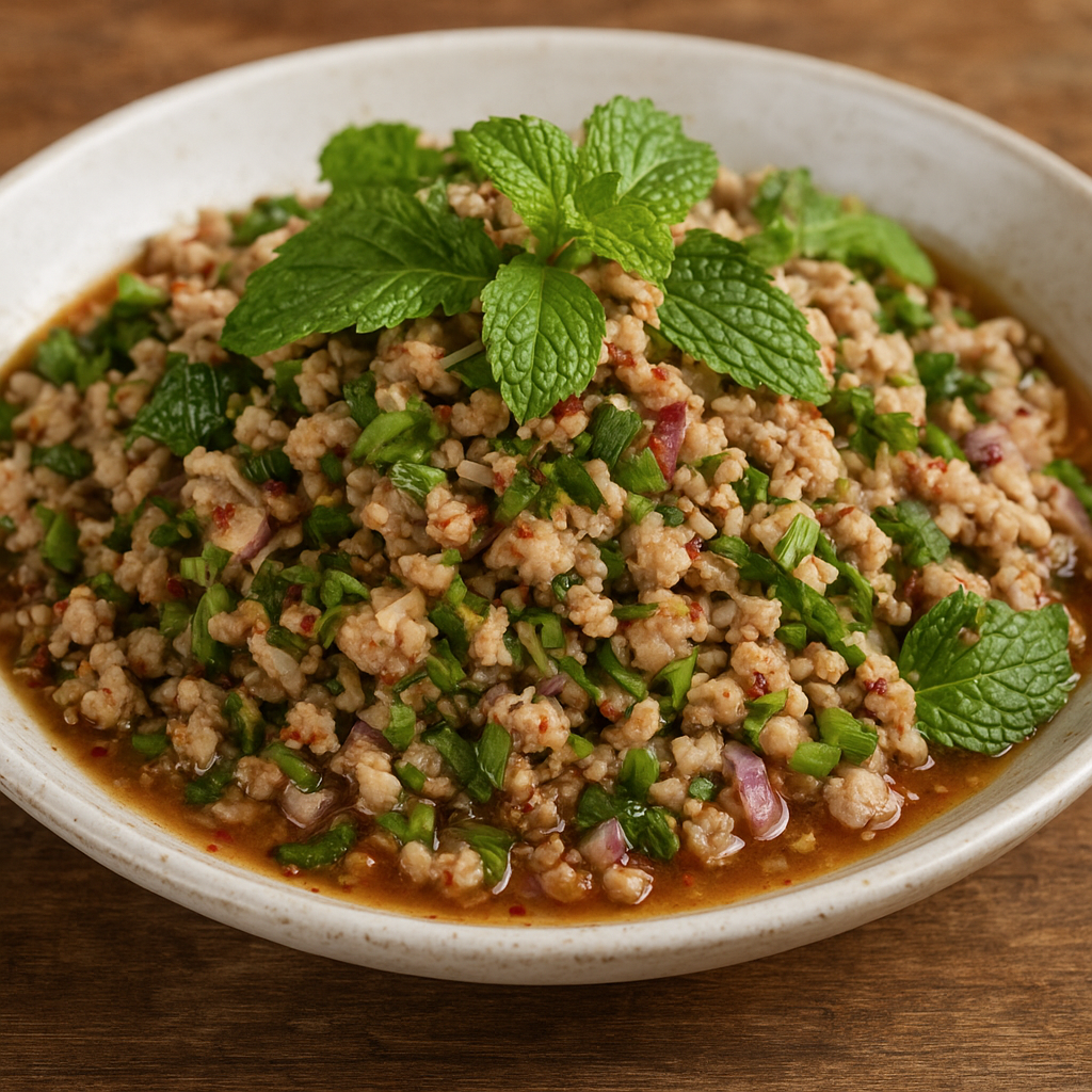 Laab (czasem zapisywany jako larb, laap, laap moo w zależności od dialektu i rodzaju mięsa) wywodzi się z Laos i północno-wschodnich regionów Tajlandii (Isan), gdzie wpływy kulinarne obu krajów wzajemnie się przenikają. To danie ma silne osadzenie w tradycjach lokalnych społeczności: bywa częścią ceremonii, spotkań rodzinnych, a także codziennych posiłków. W Laosie i w regionie Isan Laab traktowany jest jako sposób celebracji świeżych ziół i prostych przypraw — składniki te są od zawsze łatwo dostępne i doskonale współgrają z lokalnym stylem jedzenia opartego na ryżu i ostrych smakach.