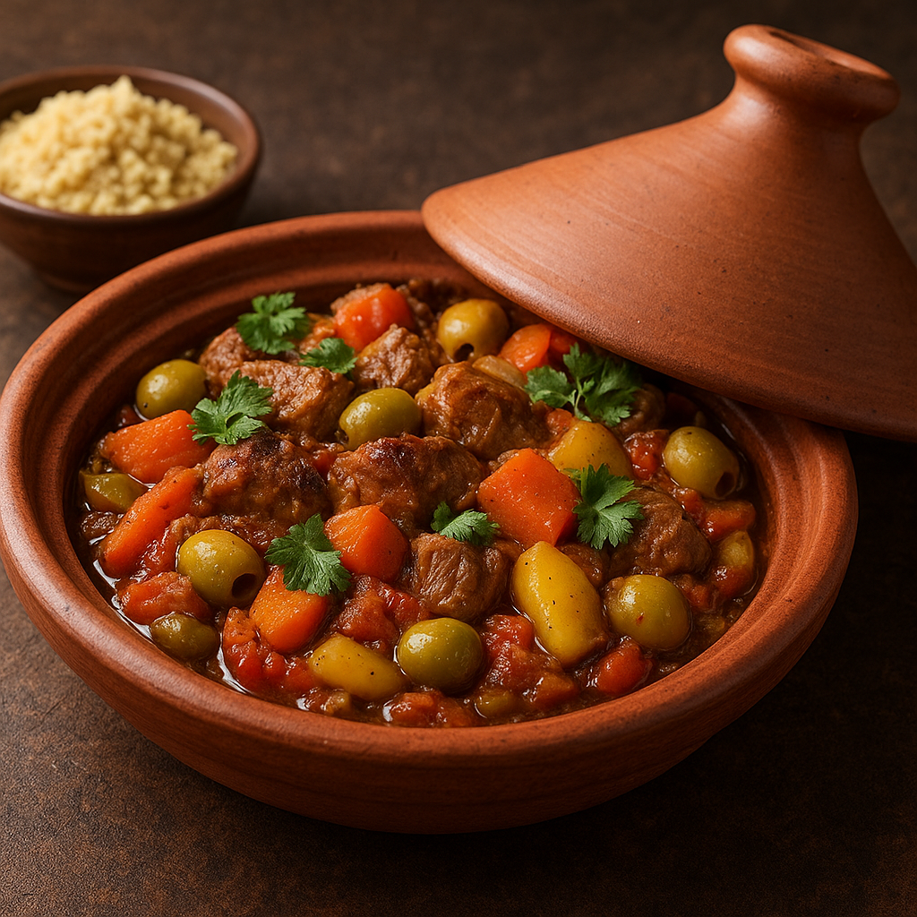 Tagine to potrawa duszona, najczęściej oparta na mięsie (najczęściej baranina, jagnięcina lub kurczak) i warzywach, gotowana długo na małym ogniu z dodatkiem aromatycznych przypraw i suszonych owoców. Kluczową rolę odgrywa tu naczynie o tej samej nazwie: składa się z płaskiego dna i wysokiej, stożkowatej pokrywki, która kieruje parę z powrotem na dno, zapewniając soczystość i intensyfikując smaki.
