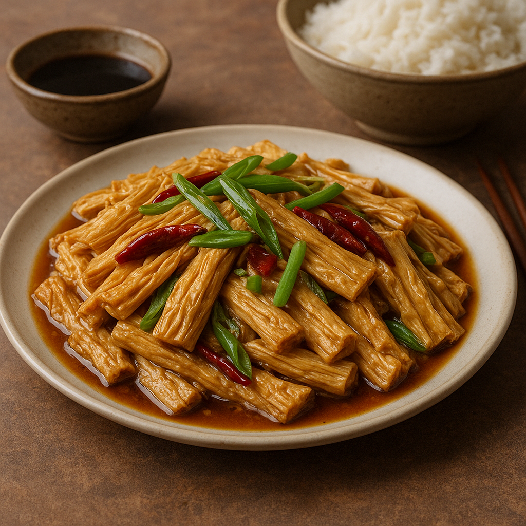 - Stir-fry z yubą i papryką: paski yuby smażone z kolorową papryką, boczniakami, sosami sojowym i ostrym — szybkie, aromatyczne danie.