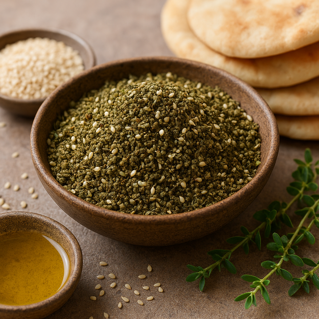 • Libanese za’atar: często intensywnie ziołowy, z większą ilością Origanum syriacum.